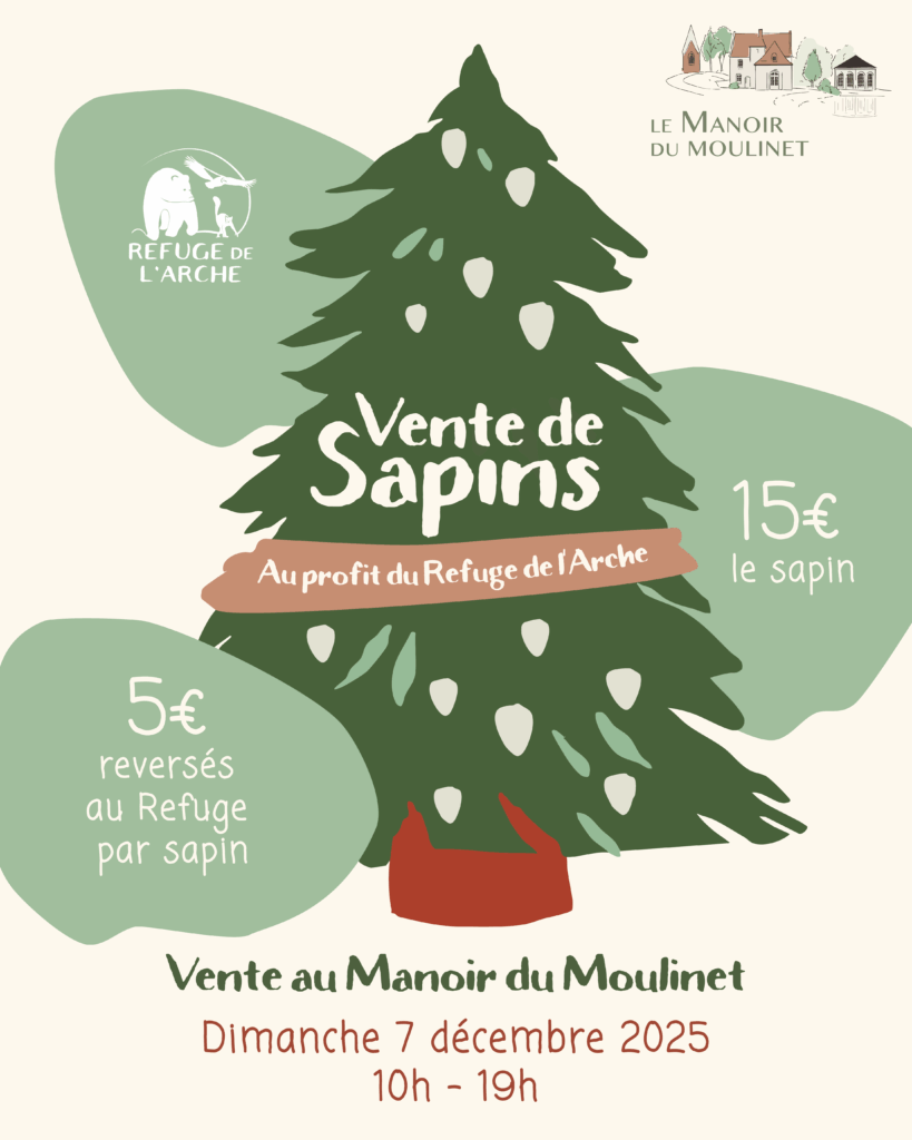 Le Manoir du Moulinet accueille cette année une vente solidaire de sapins, entièrement organisée au profit du Refuge de l’Arche. Une belle occasion de préparer vos fêtes tout en soutenant notre mission auprès des animaux recueillis.